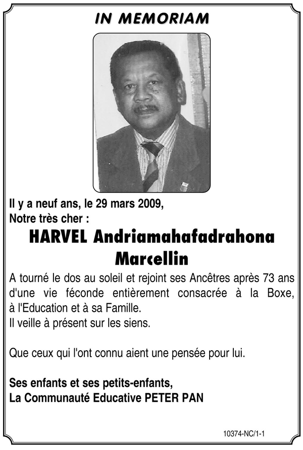 Nahavita be teo amin’ny sehatry ny Fanabeazana sy ny Fanatanjahantena ary nitondra avo aman-taonany maro ny Fanevam-pirenena tany ampitan-dranomasina Ny Andriana Ramahafadrahona Marcellin HARVEL.