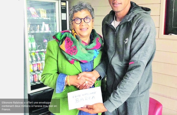 Une initiative louable. Un groupe d’anciennes et actuelles joueuses de basketball a apporté son soutien à la sélection malgache de football, hier en France. Une enveloppe a ainsi été offerte par Eléonore Ralaivao, ancienne joueuse de l’équipe nationale de 1971 à 1981, au capitaine des Barea, Faneva Andriatsima. « Il y a quelques semaines, j’ai discuté avec un proche à Madagascar, du football et de la situation de l’équipe nationale. Je voulais aider celle-ci et j’en ai parlé à mon mari. Il m’a alors proposé de solliciter mes amies anciennes et actuelles joueuses de basketball. Elles y ont immédiatement adhéré quand je leur ai fait part de mon idée », confie Eléonore.