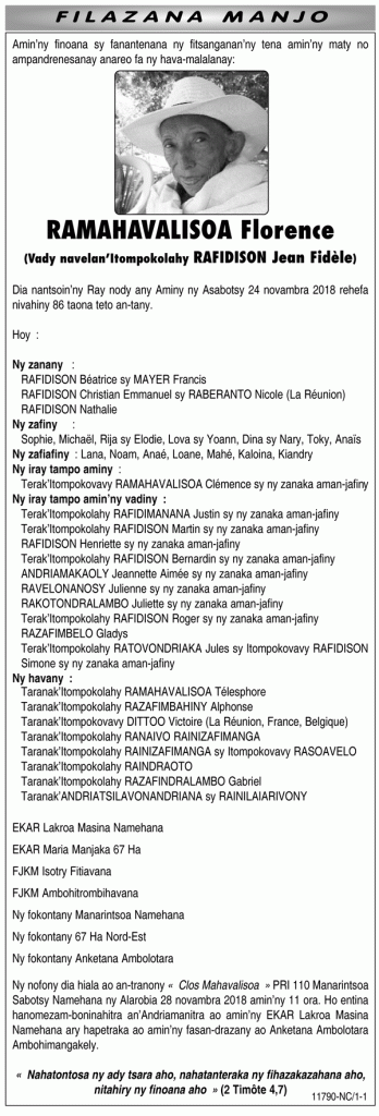 Cette entrée a été publiée dans Famille, Société et taguée Ramahavalisoa Florence.