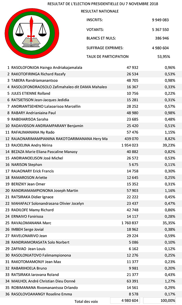 Les résultats officiels publiés par la HCC diffèrent trés peu de ceux publiés par la Commission électorale nationale indépendante (CENI). En effet, si la CENI avait attribué 39,19 % des voix à Andry Rajoelina, contre 35,29 à Marc Ravalomanana, la HCC, elle, a octroyé 39,23% au premier, contre 35,35% au second.