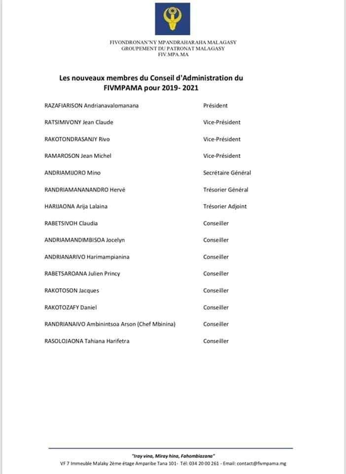 L’élection des nouveaux membres du Conseil d’Administration FIVMPAMA (Fivondronan’ny Mpandraharaha Malagasy) s’est tenue à la Chambre de Commerce et d’Industrie d’Antananarivo.
