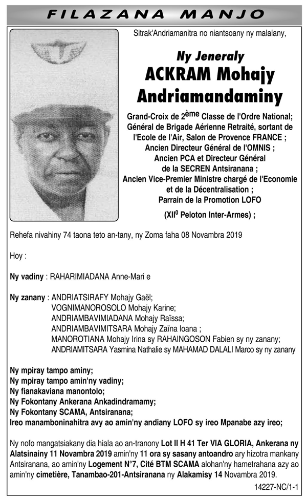 Après une longue maladie, le Général Ackram Mohajy Andriamandaminy a rendu l’âme mais jamais son arme. C’était une grande figure qui possédait plusieurs cordes à son arc. De son vivant, après une carrière enrichie et réussie, il a laissé ses empreintes dans le monde politique et la gestion des départements rattachés au développement. Mis à part son parcours au sein de l’Armée de l’air malgache, durant la Deuxième République, il était Conseil provincial à Antsiranana pendant que le régime du gouvernorat était appliqué sur le territoire.