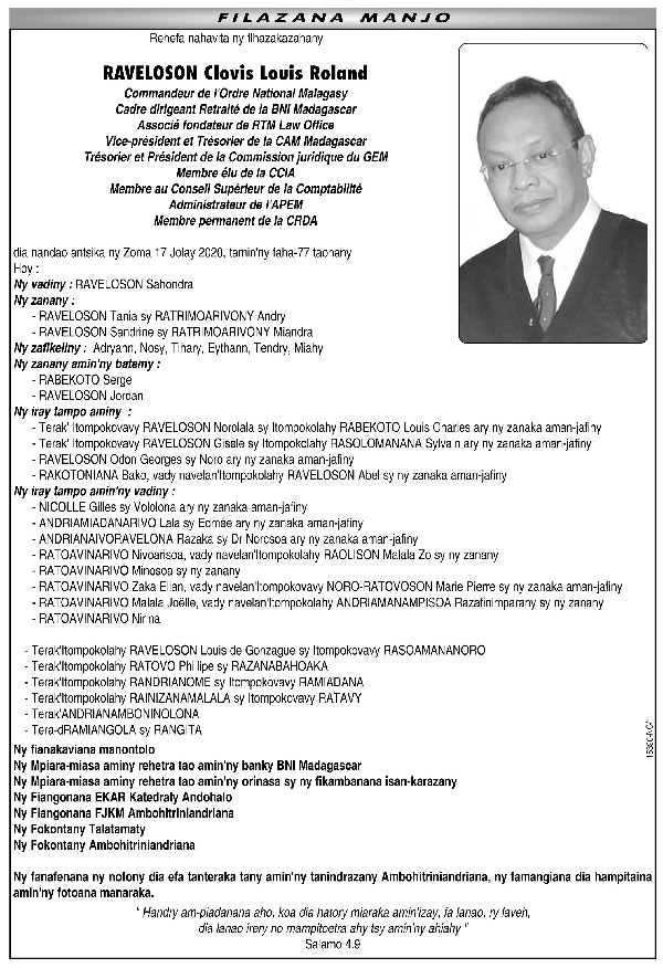 L’ancien Bâtonnier, Maître Yves Ratrimoarivony, et le juriste Financier Clovis Raveloson ont rejoint leurs ancêtres