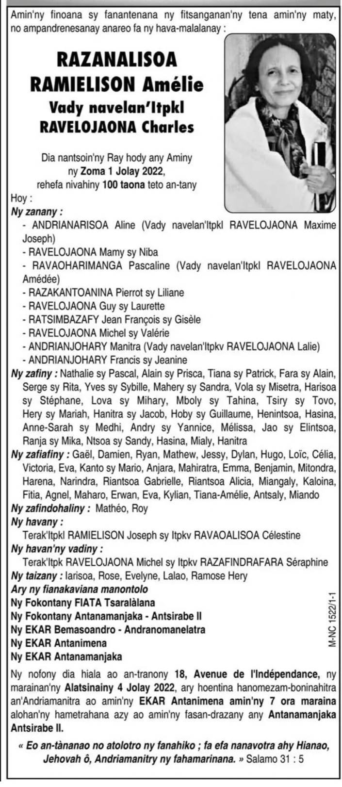 Cette entrée a été publiée dans Famille, Malagasy, Société et taguée Ravelojaona, Razanalisoa Ramielison Amélie.