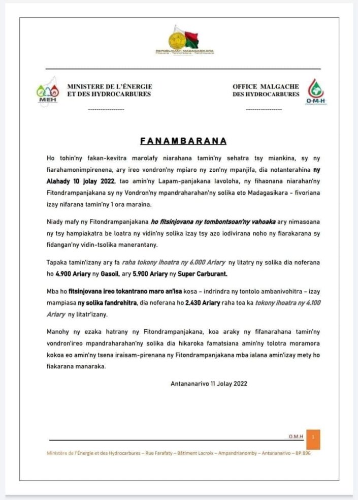 Les nouveaux prix de carburant sont maintenant connus. Selon les informations diffusées par le ministre de l’Energie et des Hydrocarbures sur sa page facebook ce lundi matin, le supercarburant est commercialisé à 5900 Ariary le litre, 4900 Ariary pour le gasoil et 2430 Ariary pour le pétrole lampant. “Le prix du supercarburant et du gasoil devront déjà dépasser la barre des 6000 Ariary et le pétrole lampant à plus de 4 100 Ariary mais les pourparlers, terminés à 1 heure ce matin, ont donné ces résultats afin de préserver les portefeuilles des consommateurs”, indique le communiqué du ministère de l’Energie et des Hydrocarbures.