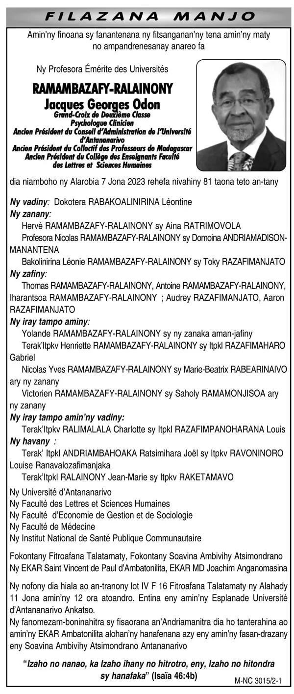 Les adieux solennels et sobres de l’Université d’Antananarivo au professeur Jacques Ralainony Ramambazafy se sont tenus hier, en début d’après-midi. Un grand homme de savoir, doublé de la générosité incarnée.
