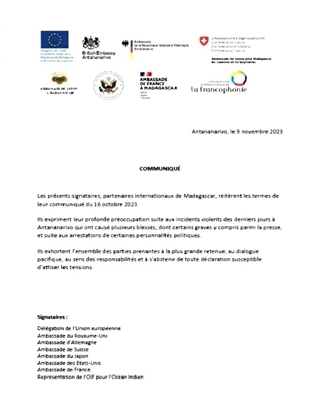 Les partenaires internationaux de Madagascar réitèrent leurs profondes préoccupations suite aux incidents violents, aux blessures graves et aux arrestations de personnalité politiques de ces derniers jours. « Exhortent l’ensemble des parties prenantes à la plus grande retenue et au dialogue »