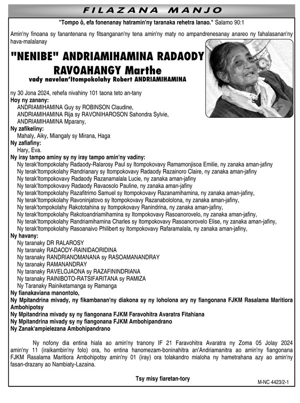 Cette entrée a été publiée dans Andriantsilavonandriana, Famille, Nécrologie, Société et taguée Marthe Ravoahangy Andriamihamina.