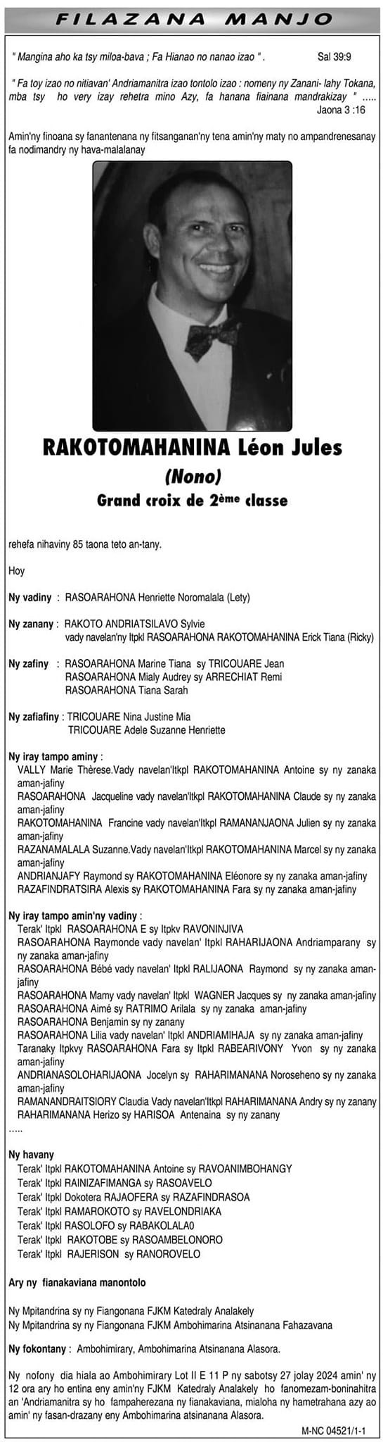 Cette entrée a été publiée dans Andriantsilavonandriana, Famille, Kanto sy Hira, Malagasy, Nécrologie, Société et taguée Rakotomahanina Kéon Jules.