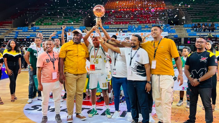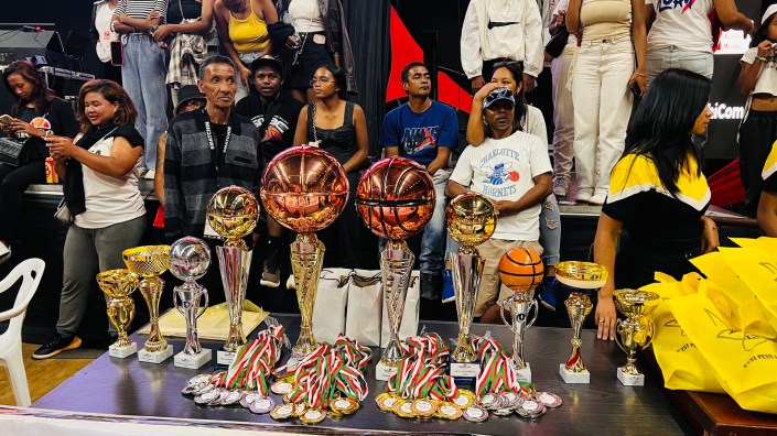 Le ministre de la Jeunesse et des Sports, Abdulah Marson Moustapha (en casquette), avec Ramarozaka Lucas (l’un des organisateurs de l’évènement culturel et sportif.Jean Hubert Rajaonarivelo (avec badge), un féru du sport et de musique) devant les trophées