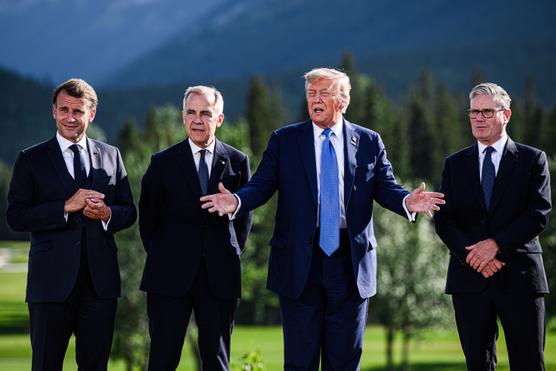Le président français, Emmanuel Macron, le premier ministre canadien, Mark Carney, le président américain, Donald Trump, et le premier ministre britannique, Keir Starmer, lors de la « photo de famille » du sommet du G7 à Kananaskis, le 16 juin 2025. JULIEN MUGUET POUR « LE MONDE »