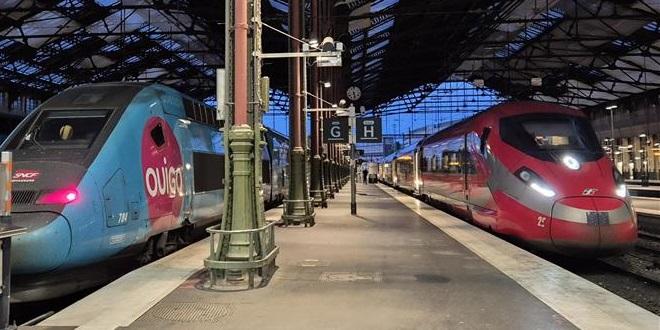 S’il fallait une illustration de l’ouverture à la concurrence ferroviaire, c’est bien celle-là : sur le même quai, une rame Ouigo de la SNCF faisant face à un Frecciarossa, le train à grande vitesse de Trenitalia. À neuf minutes d’intervalle, ce dimanche 15 juin peu avant 6 heures en gare de Paris-Lyon, les deux rames s’apprêtent à s’élancer à 300 km/h vers la même destination : Marseille.