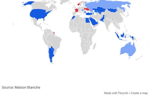 Comme vous pouvez le voir sur la carte ci-dessous figurent donc : Arabie saoudite, Argentine, Arménie, Azerbaïdjan, Bahreïn, Bulgarie, Égypte, Émirats arabes unis, États-Unis, Hongrie, Indonésie, Jordanie, Kazakhstan, Kosovo, Maroc, Mongolie, Pakistan, Paraguay, Qatar, Turquie, Ouzbékistan. « Dans la plupart des cas (ce sont) des dirigeants très populaires, dans d’autres cas moins populaires. C’est comme ça dans la vie », a lancé Donald Trump.