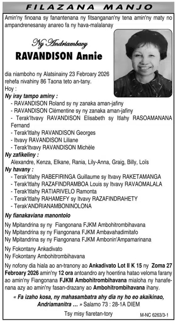 Cette entrée a été publiée dans Nécrologie et taguée N/AB Ravandison Annie.