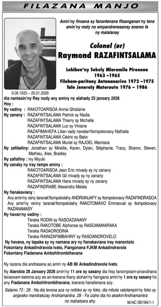 Le monde politique et académique malgache est en deuil. Le Dr André Rasolo, âgé de 82 ans, est décédé samedi. Maître conférencier au sein de la mention Sociologie de la Faculté d’Économie et de Gestion de l’université d’Antananarivo et à l’Université catholique de Madagascar, il était également docteur en science politique. Il a notamment publié Regards sur la vie politique à Madagascar de 1960 à 2020, une référence sur l’histoire politique du pays, et a été l’initiateur d’un laboratoire de sociologie politique au sein de sa faculté.