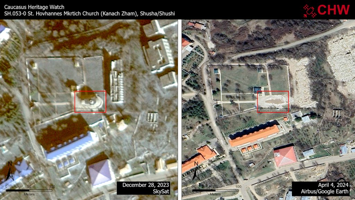 Parmi elles, l’église Saint-Sargis de Hadrut, datant du XVIIIe siècle, détruite en 2022, a vu son terrain déblayé pour ériger une nouvelle construction. Le 4 avril 2024, l’église Saint-Jean-Baptiste de Chouchi, endommagée par des bombes azerbaïdjanaises en 2020, a été rasée. Construite en 1847, la «chapelle verte» a été entièrement rayée de la carte, selon l’ONG Caucasus Heritage Watch, qui s’appuie notamment sur des images fournies par l’université de Cornell aux États-Unis.