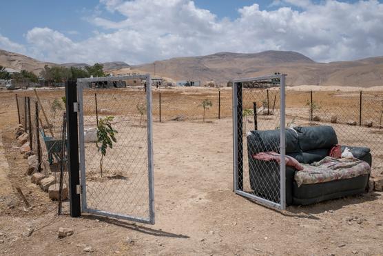 Un enclos installé par des colons pour y planter des arbes, signe d’un projet de construction d’une nouvelle colonie illégale sur les terres du village bédouin de Mouarrajat (Cisjordanie), le 25 mai 2024. VIRGINIE NGUYEN HOANG / HUMA POUR « LE MONDE »