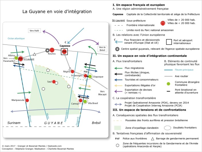 La Guyane est à la croisée des chemins, mais dans un monde de plus en plus globalisé, la diversité de sa population et de ses appartenances et sa potentielle position d’interface constituent des atouts à saisir pour un territoire si longtemps ignoré et isolé. Le tout nouveau pont sur l’Oyapock en sera peut-être l’illustration.