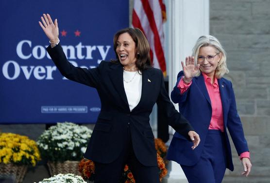 La candidate démocrate à l’élection présidentielle et vice-présidente des Etats-Unis, Kamala Harris, et l’ancienne membre républicaine de la Chambre des représentants, Liz Cheney, à Ripon (Wisconsin), le 3 octobre 2024. EVELYN HOCKSTEIN / REUTERS