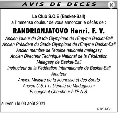 Décès de l’ancien ministre Randrianjatovo Henri du SOE (Stade Olympique de l’Emyrne)