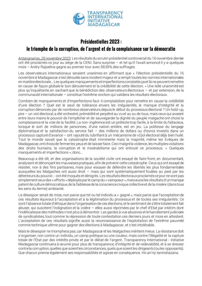 « Un hold-up, pire – un viol électoral, a été orchestré, prémédité et perpétré au vu et au su de tous, mais ceux qui avaient entre leurs mains le pouvoir de l’empêcher et de sauvegarder la dignité du peuple malgache ont choisi la complaisance et la voie de la facilité. », affirme TI-IM.