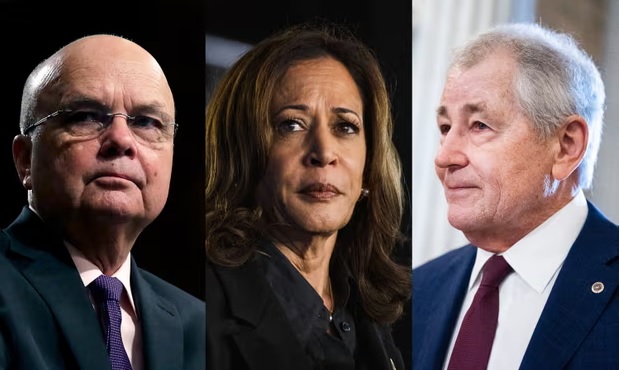 Kamala Harris has secured endorsements from Republican stalwarts like former CIA director Michael Hayden, left, and former defense secretary Chuck Hagel, right. Composite: Getty Images, ZUMA/Rex/Shutterstock, CQ-Roll Call