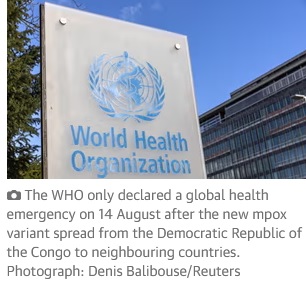 Mpox is a potentially deadly infection that causes flu-like symptoms and pus-filled lesions, and spreads through close physical contact. It was declared a global health emergency by the WHO on 14 August after the new variant, known as clade Ib, began to spread from the Democratic Republic of the Congo into neighbouring African countries.
